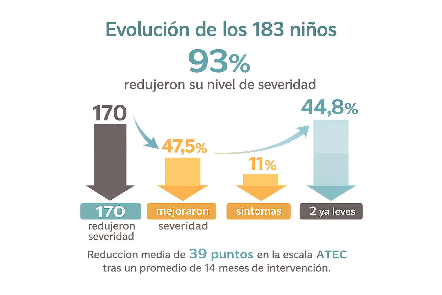 El 93% mejoraron su severidad: 170 redujeron su nivel de severidad, 11 casos no cambiaron de nivel, pero mejoraron su punutación ATEC y 2 casos sin posibilidad de reducción evaluable por medio de esta escala, porque ya eran leves al inicio. La mayoría de los participantes redujo entre 1 y 2 niveles de severidad