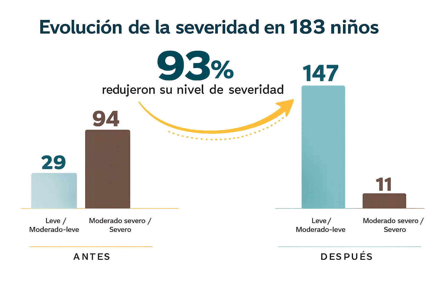 Al inicio del estudio, la mayoría de los niños se encontraba en niveles moderado-severo o severo. Tras una media de 14 meses de intervención o menos: